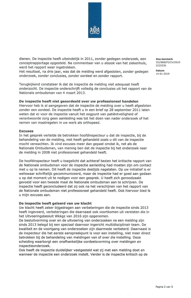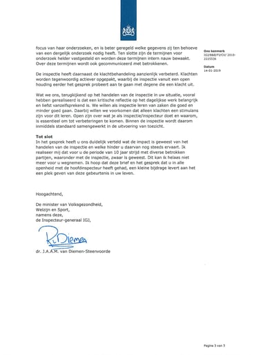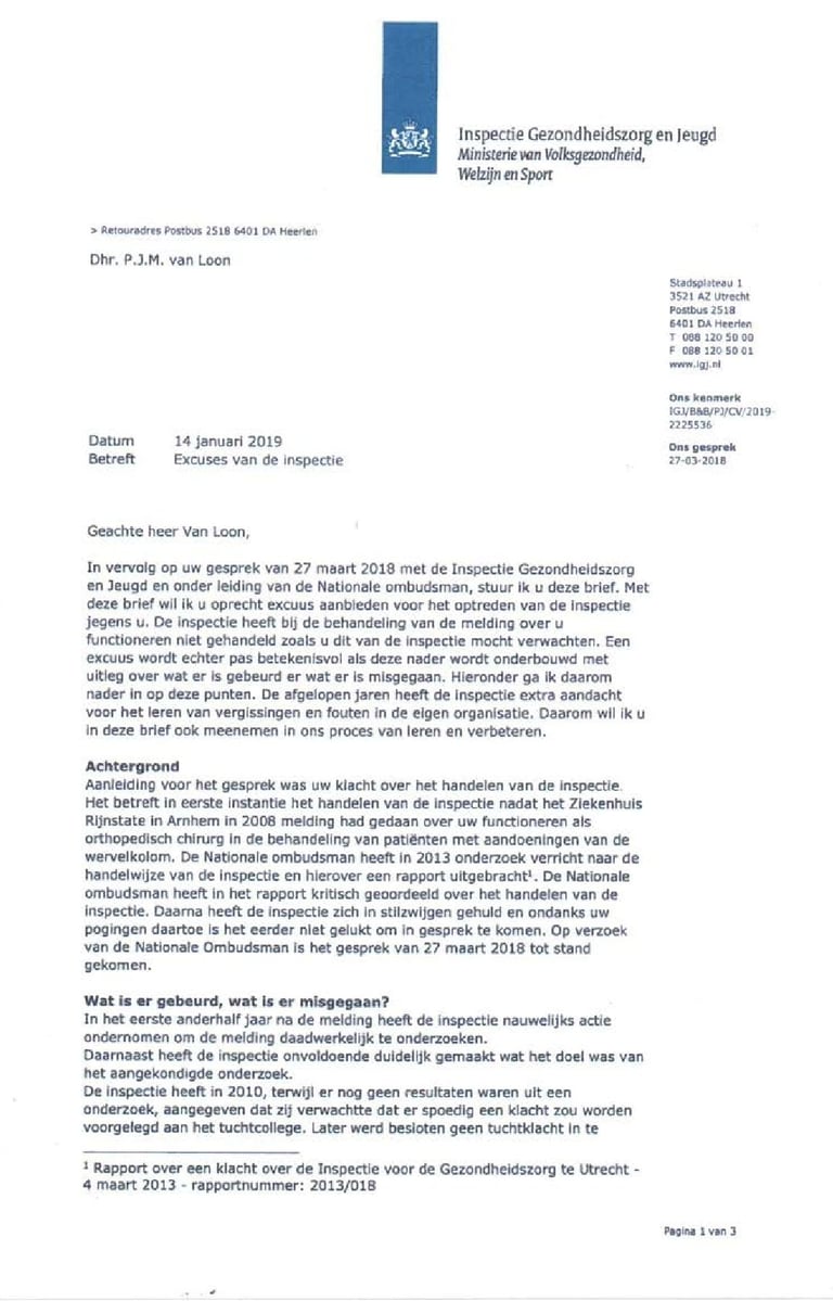 Op 10 mei 2024 reageert de IGJ per e-mail: "Het dossier van de heer Van Loon is voor de IGJ afgesloten. Het spijt ons dat we geen aanvullende vragen kunnen beantwoorden, ook niet voor journalistiek gebruik." Eerder, in 2018, biedt de inspectie schriftelijk excuses aan Van Loon aan voor haar handelen: "De IGZ heeft haar eigen beoordelingskaders overschreden, de beoordeling was onzorgvuldig en de communicatie richting de heer Van Loon had niet zo mogen verlopen."