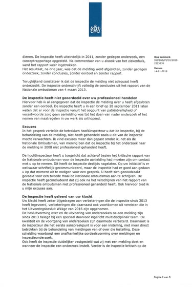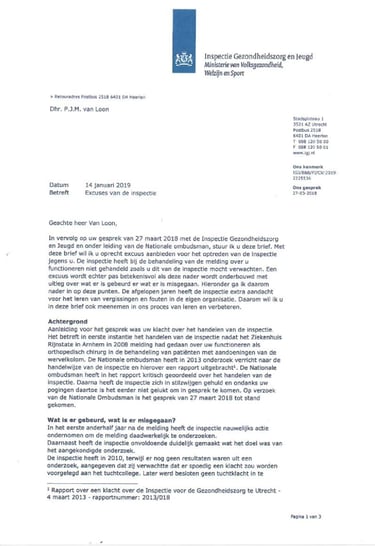 De Nationale Ombudsman bevestigt in 2013 in een vernietigend rapport dat de IGJ ernstig tekortgeschoten was. In een recente e-mail uit april 2024 schrijft de Ombudsman: "Wij blijven achter ons rapport staan. De zaak-Van Loon is een voorbeeld van hoe toezicht ontspoorde. Het dossier is echter gesloten; de heer Van Loon heeft reeds genoegzaam gelijk gekregen."